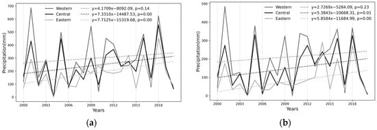 At the 95th percentile threshold, the eastern region shows the most pronounced upward trend, with an increase of 77.1 mm decade−1 in extreme precipitation. This trend suggests an escalating frequency and intensity of extreme rainfall during typhoon events in this area. Extreme precipitation in the central region shows marked increases at both percentile thresholds: 73.3 mm decade−1 (95th percentile) and 58.6 mm decade−1 (99th percentile). This consistent rise suggests a uniform intensification of extreme rainfall events during typhoons across different intensity levels. In contrast, the western region demonstrates a more modest change, with a slight upward trend of 27.3 mm decade−1 observed only at the 99th percentile threshold, indicating that only the most extreme events are intensifying in this area.