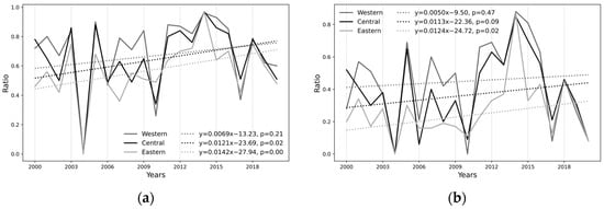 For trend analysis, the Theil–Sen regression method was used due to its robustness to outliers [29]. Data were smoothed using a three-point average method. Pearson correlation coefficients assessed relationships between typhoon extreme precipitation characteristics and total precipitation amounts.