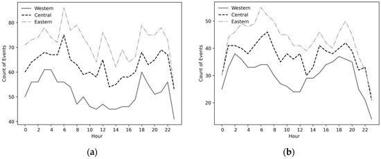 Figure 8 depicts the diurnal cycle of extreme precipitation across three sub-regions. The data shows a bimodal distribution, with maxima during the early morning hours (0200–0700 h at UTC) and late afternoon to evening (1800–2000 h at UTC), and minima around 0000 and 1200 h UTC. Hainan Island’s tropical monsoon climate is characterized by intense solar radiation, which enhances surface heating and promotes convective activity. This convective peak in the late afternoon often triggers significant precipitation events. Conversely, by the early morning, surface cooling increases atmospheric stability, promoting water vapor condensation and precipitation formation. The eastern region experiences the highest frequency of extreme precipitation, with over 50 occurrences at the 99th percentile during several hours. The western region records these events less frequently. These findings align with research by Manuel F. Rios Gaona [17], who reported that the highest rainfall during typhoon events typically occurs at 0200, 0500, 1400, and 1800 h UTC [3].