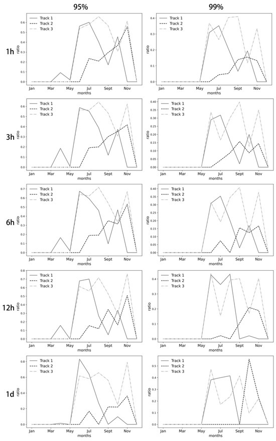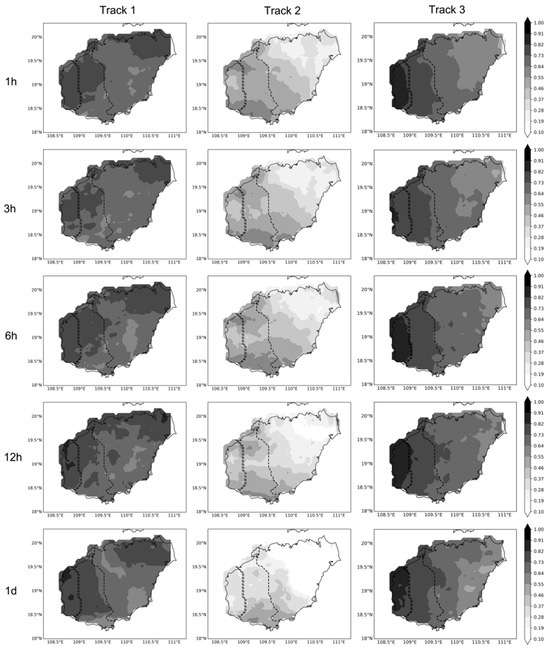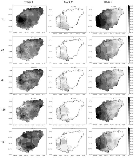 There are notable differences in the temporal contribution rates among the typhoons following different tracks. Track 1 typhoons exhibit peak contribution rates between June and August, significantly impacting the terrestrial regions of Hainan Island during this period. High contribution rates are also observed in October, but gradually decline with increasing time scales, indicating that typhoons in October generally exert a relatively brief and weaker impact before swiftly relocating. Track 2 typhoons display varied seasonal patterns. At an hourly scale, a notable peak occurs from September to November. As time scales increase, contribution rates significantly amplify from June to August, albeit with a decline in the 1-day scale contribution rates during these months. This pattern indicates a broader temporal impact of these typhoons on Hainan Island, with extreme precipitation events primarily concentrated between September and November. Track 3 typhoons show a more consistent pattern, affecting Hainan Island from June to November. However, the impacts are comparatively moderate in July and October, potentially linked to the specific climatic dynamics inherent to this track.