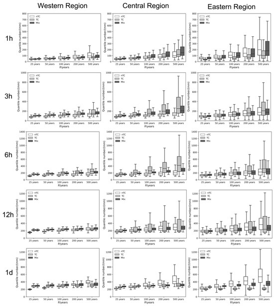 On shorter return periods, both the western and eastern regions exhibit a higher Mix percentile compared to nTC. However, this relationship reverses in favor of nTC on longer return periods (12 h or 1 day). Additionally, the percentiles for TC initially increase and subsequently decrease, a pattern that likely reflects the short-duration impacts of typhoons, which typically affect the island for 2 to 3 days and may not persist throughout an entire day. The transient nature of typhoon-induced precipitation is critical for accurate statistical analysis. When examining longer time periods, these brief but intense rainfall events can lead to underestimation of percentiles if not properly accounted for. This potential bias highlights the importance of careful methodology in resampling and statistical assessments of extreme precipitation events.