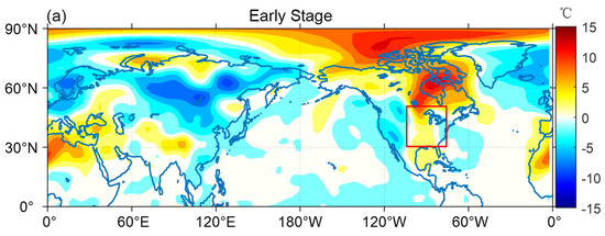 The distribution of the temperature anomaly in the Northern Hemisphere is shown in Figure 1a–c. It is clear that in the Early Stage, the US (75° W–105° W, 30° N–50° N, the red boxes in Figure 1a–c) had not yet been affected by cold air and was generally warming up (Figure 1a). In the Development Stage, extreme cooling had already occurred in the Canadian region (Figure 1b), while extreme cooling in the US was concentrated in the Outbreak Stage (Figure 1c). It could be inferred that the origin of the cold event was located in the northern part of NA, with cold air moving southward, passing through Canada before further infiltrating the US. However, during the same time stage, other continents in the Northern Hemisphere, such as Asia and Europe, did not experience such extreme cooling.