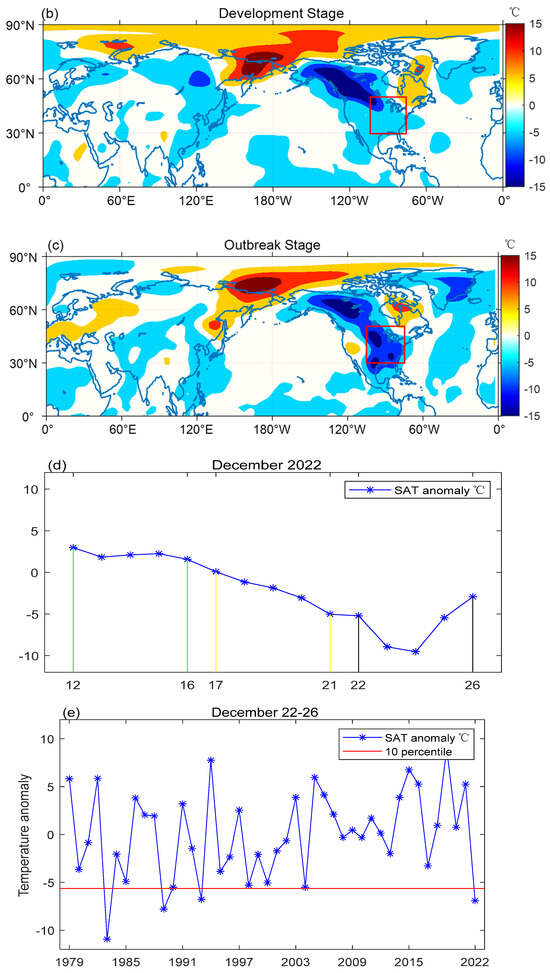 The anomaly of the surface air temperature (SAT) in the Early Stage (a), the anomaly of the SAT in the Development Stage (b), and the anomaly of the SAT in the Outbreak Stage for this extreme cold event (c): the red boxes represent the United States (US) (75° W−105° W, 30° N−50° N). Time series of regional mean of SAT anomaly in the US on 12−26 December 2022 (d): the area between the black lines represents the Outbreak Stage. Time series of the SAT anomaly in the US on 22−26 December from 1979 to 2022 (e): the red line is the 10th percentile of the SAT on December 22−26 from 1979 to 2022. The corresponding climatological variables are in December from 1979 to 2022.
