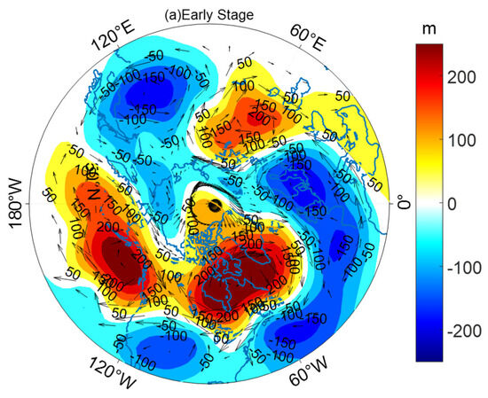 To study the evolution of this extreme cold event, further analysis was conducted on the anomaly regarding GH, wind fields, U-wind, and V-wind. In the Early Stage, a high-pressure system existed over the Canadian Arctic Archipelago (the maximum anomaly reached 399.45 m), while another high-pressure system was present to the south of Alaska (the maximum anomaly reached 309.01 m). This pressure distribution facilitated the southward escape of Arctic cold air (Figure 2a). In the Development Stage, the high-pressure system over the Archipelago remained dominant, while the high-pressure system over Alaska shifted northward (the maximum anomaly reached 437.44 m), allowing cold air to move southward into Canada (Figure 2b). As a low-pressure center developed over the US (the minimum anomaly reached −170.01 m), cold air successfully entered the country, leading to the outbreak of this extreme cold event (Figure 2c). However, due to the barrier formed by the Rocky Mountains, the impact on the western US was relatively minor (Figure 1c).