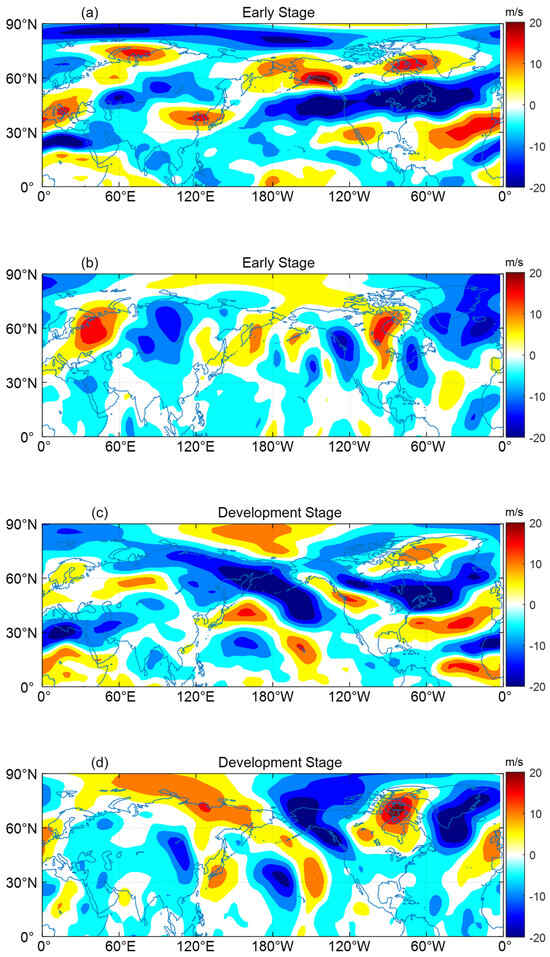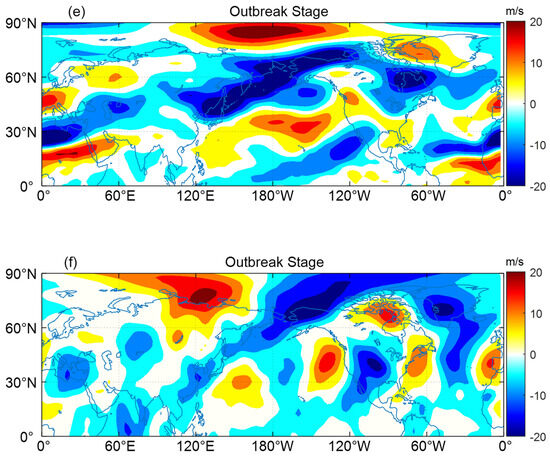 In the Early Stage, the U-wind in the northern part of NA (60° N–70° N) exhibited a positive anomaly, while the U-wind in central NA (40° N–50° N) showed a negative anomaly (Figure 3a). Throughout NA, the V-wind was mainly a positive anomaly (Figure 3b). In this situation, cold air moving southward from the Arctic was blocked in Alaska and the northern part of NA. During the Development Stage, the positive anomaly of the U-wind in the northern part of NA (60° N–70° N) weakened and gradually transitioned to the negative anomaly (the minimum anomaly reached −18.32 m/s) (Figure 3c), while the V-wind in Alaska and the US began to show a negative anomaly (Figure 3d). In the Outbreak Stage, both the U-wind in the northern part of NA (60° N–70° N) (the minimum anomaly reached −21.18 m/s) and the V-wind in the US (the minimum anomaly reached −17.26 m/s) showed a negative anomaly, leading to an extreme cold event (Figure 3e,f). Throughout the evolution of the three stages, there was a weakening trend in both the U-wind in the northern part of NA (60° N–70° N) and the V-wind in the US, creating conditions for the southward movement of cold air. Eventually, the cold air entered NA, passing through Canada to reach the US.
