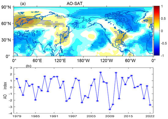 The regression coefficients of the December Arctic Oscillation (AO) index with temperature from 17 to 26 December of 1979−2022. The significant areas at the 90% confidence level are dotted (a). The AO Index for December of 1979−2022 (b). The corresponding climatological variables are in December from 1979 to 2022.