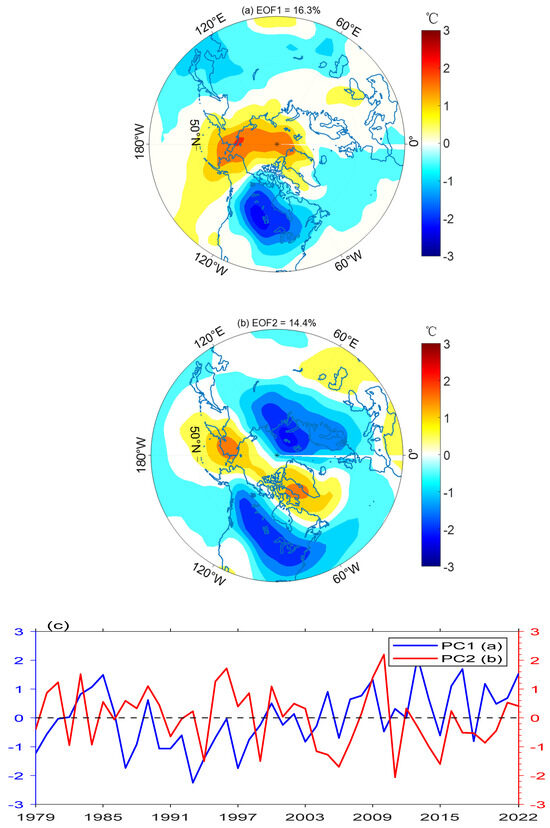 We used an EOF analysis to examine the long-term spatial variability of the SAT anomaly from 1979 to December 2022, and the results are shown in Figure 5. In EOF1 (16.3%), positive values were concentrated in the Arctic region, while negative values were concentrated in Canada (Figure 5a). PC1 showed an increasing trend (Figure 5c). This pattern corresponded with the process of cold air intrusion into NA and was similar to the results of the regression analysis multiplied by −1, indicating that the spatial distribution of EOF1 was primarily contributed by the AO. In EOF2 (14.4%), positive values appeared in Alaska and the Archipelago region, while negative values appeared in the Arctic and in NA, including the US (Figure 5b). In this mode, an extreme cold event occurred in the US [17]. Figure 5c shows the time series of these two modes.