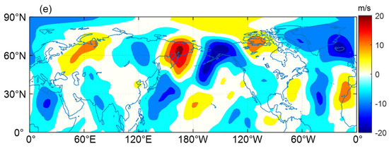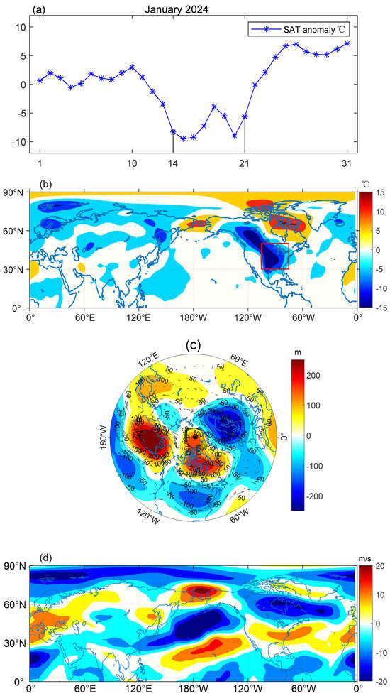 In January 2024, the US experienced another extreme cold event, which lasted from 14 to 21 January, with the lowest SAT anomaly at −9.50 °C (Figure 6a). This study compared this cold wave with the one that occurred in December 2022 through a simple analysis of the SAT (Figure 6b), GH (Figure 6c), wind fields, U-wind (Figure 6d), and V-wind (Figure 6e). During the outbreak of the cold event in January 2024 in the US, the northern parts of NA, including the Islands and Alaska, were under high-pressure conditions, with maximum anomaly values of 310.49 m and 389.30 m, respectively. Conversely, the US experienced low-pressure conditions, with a minimum anomaly value of −151.35 m. Similarly, the U-wind anomaly over the northern part of NA was negative, reaching a minimum of −18.21 m/s. However, the V-wind anomaly over the US, though negative, reached a minimum of only −5.27 m/s.