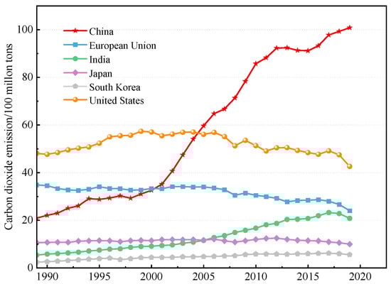 Global climate change has led to frequent extreme weather events that are seriously affecting human sustainable development; carbon dioxide emissions have been identified as the main cause underlying global climate change []. According to IEA [], as shown in Figure 1, China has surpassed the United States as the world’s largest carbon dioxide emitter since 2005. In 2021, China’s carbon dioxide emissions accounted for approximately 32.95% of the global total carbon dioxide emissions. Therefore, China is facing unprecedented pressure from a global warming perspective.