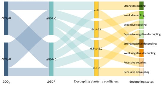 is the Tapio decoupling elastic coefficient. and are the differences in carbon dioxide emissions and GDP between two adjacent periods, respectively. e and g are the growth rate of carbon dioxide emissions and GDP, respectively [].