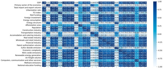 Based on this paper’s selection of 26 influencing factors from the seven aspects of economy, industrial structure, energy, society, technology, policy, and environment (examples of which are the proportion of primary industry, TCI index, afforestation area, GDP, urbanization rate, foreign investment, energy intensity, energy structure, population, and sulfur dioxide emissions), the correlation coefficients between these influencing factors are calculated. Thus, the correlation coefficient matrix between them is obtained. This paper visualizes the correlation coefficient matrix and produces a thermodynamic diagram as shown in Figure 3.