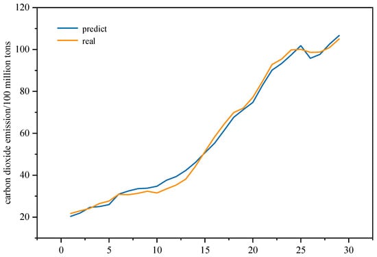 According to Figure 4, the importance of influencing factors over 0.04 is selected to predict carbon dioxide emissions; these are population, GDP, nitric oxide emissions, research and development (R&D) funding, air freight volume, methane emissions, proportion of primary industry, patent authorization volume, energy consumption, urbanization rate, economic complexity, renewable energy generation, national education funding, total import and export volumes, proportion of real estate industry, and foreign investment. Among these, population and GDP have the greatest impact on carbon dioxide emissions. The larger the population size, the greater the energy demand, and the more carbon dioxide emissions are generated. Coupled with the dependence of economic growth on energy consumption, the trend of carbon dioxide emissions has been increasing. The screened influencing factors can more accurately predict the trend of carbon dioxide emissions.
