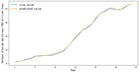 The LSTM model is mainly used to process time series data. China’s carbon dioxide emissions have grown rapidly and experienced periodic fluctuations since 2010. The LSTM model can effectively digest this upward trend information and retain the long-term variation pattern of the sequence, thus making it very suitable to predict China’s carbon peak state []. Based on the evaluation indicators of predicted and true values, they are compared with several models and the model with the best prediction performance is selected for the prediction.