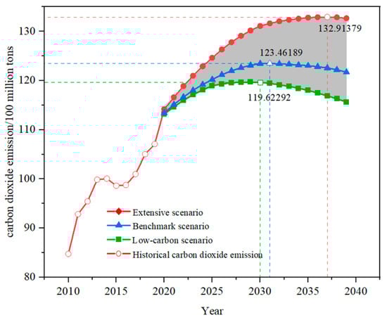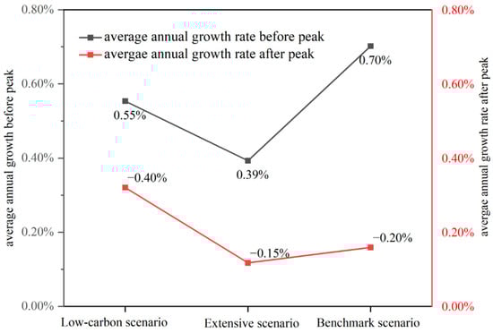 Figure 9 shows that under the three scenarios, the peak value is relatively high and the post peak change rate is small; the decrease in carbon dioxide emissions is relatively stable, and without strict constraints on the economy and energy, it will be challenging for China to achieve carbon neutrality by 2060. Moreover, Figure 10 shows that the change rates before and after the peak value differ between the three scenarios. In the benchmark scenario, the average annual growth rate before the peak is 0.7%, and the average annual growth after the peak is −0.2%. In the low-carbon scenario, the average annual growth rate before the peak is 0.55%, and the average annual growth after the peak is −0.4%. In the extensive scenario, the average annual growth rate before the peak is 0.39%, and the average annual growth after the peak is −0.15%. The increasing rate before reaching the peak is higher than the rate of decrease after reaching the peak. By constraining factors such as the economy, energy consumption, population, and urbanization rate, the degree of carbon dioxide emissions reduction is limited; therefore, the level of technological innovation should be improved and carbon dioxide emissions should be reduced from the perspective of energy use efficiency.