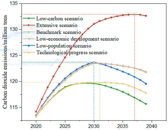 Therefore, we consider the impact of GDP growth, population growth, energy consumption, and technological progress on carbon dioxide emissions, because the energy consumption in this paper is calculated from energy intensity, and energy consumption is linked to technological progress; so based on the baseline scenario, low-carbon scenario, and extensive scenario, this paper sets the scenarios of low economic development, low population growth, and technological progress, except for the GDP (population or energy intensity) in the low-carbon scenario, other factors are set as in the baseline scenario, so as to compare with the baseline scenario. The low-carbon scenario and the extensive scenario were compared to observe the impact of changes in different factors on carbon dioxide emissions. Six scenario settings and results are shown in Table 9 and Table 10.