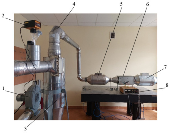 Photo of the research bench: 1—fan, 2—dispenser, 3—cyclone, 4—duct, 5—primary particle quantity measurement zone, 6—box with ion generators, 7—secondary particle quantity measurement zone, 8—ion generator controller. The sensors were placed in the positions of the research stand design elements marked with numbers 5 and 7.