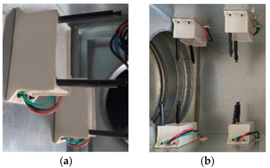 After that, analogous measurements were made for air flow moving in an ionized environment and with different amounts of ion generators. The scheme of the arrangement of ion generators is presented in Figure 6, and the working parameters are presented in Table 3.