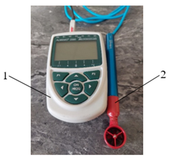 The measuring equipment ALMEMO 2590A (Ahlborn Mess- und Regelungstechnik GmbH, Holzkirchen, Germany) was used to measure the air flow speed; measuring device consists of a meter 1 and a speed measuring sensor (vane anemometer) 2 (Figure 4).