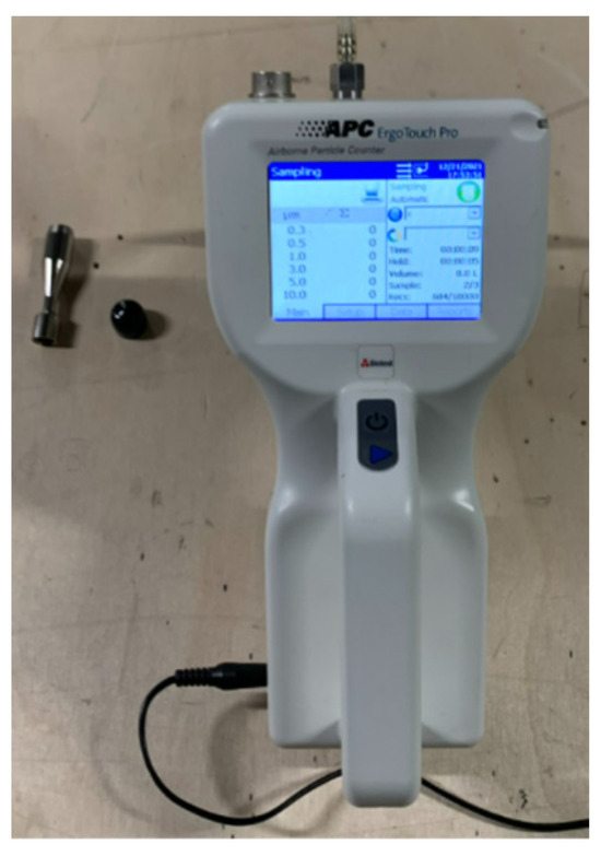 The air velocity sensor for use at higher temperatures up to 250 °C is supplied with a steel head and turbine which is bolted to the probe handle and is not replaceable. In anemometry, the accuracy of the vane probe is recognized as unsurpassed. Blade rotation is nearly linear to flow velocity and is unaffected by pressure, temperature, density, and humidity. In MiniAir probes(Schiltknecht Messtechnik AG, Gossau, Switzerland), as each metal blade passes through the probe handle, a pulse is generated by a simple magnetic receiver in the handle. The MiniAir64 vane anemometer (Schiltknecht Messtechnik AG, Gossau, Switzerland) measures the speed of gaseous media and water, with a direct 4–20 mA output. The Swiss Precision MiniAir64 Vane (Schiltknecht Messtechnik AG, Gossau, Switzerland) probe is unique. The lamella rotation has a very low resistance and is not affected by pressure, temperature, density, or humidity. A compact and easy-to-use particle counter “APC ErgoTouch Pro” (Merck KGaA, Darmstadt, Germany) was used for particle quantity measurements (Figure 5).