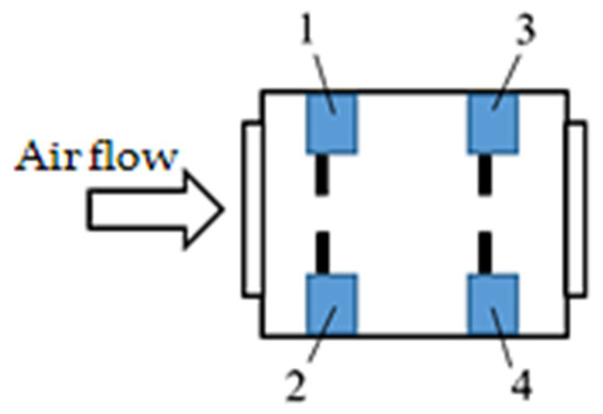 A schematic diagram of the arrangement of ion generators in a box, 1; 2; 3; 4—ion generators. Air flow.