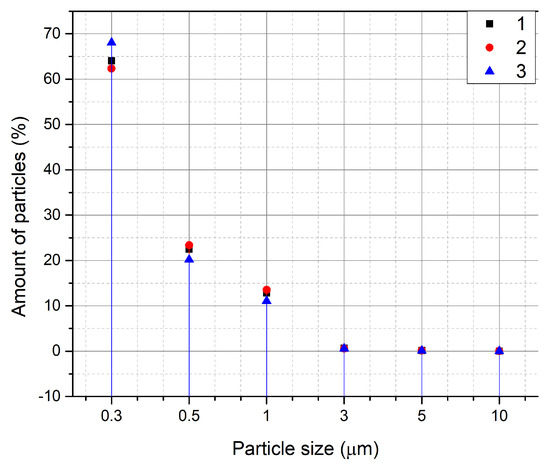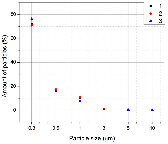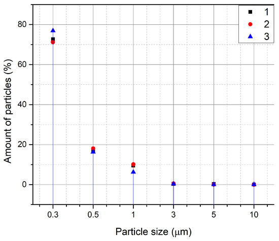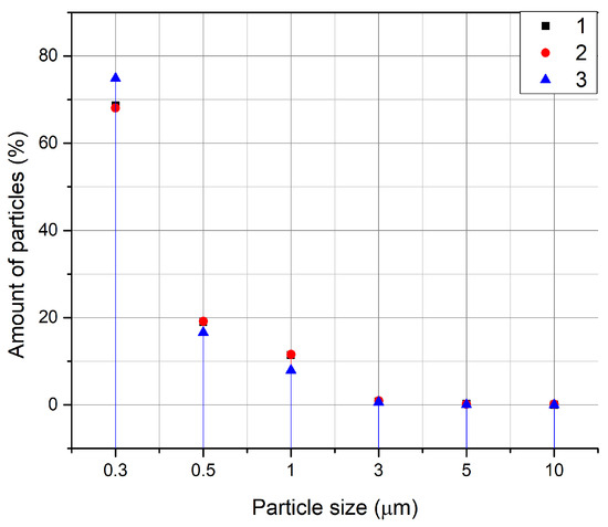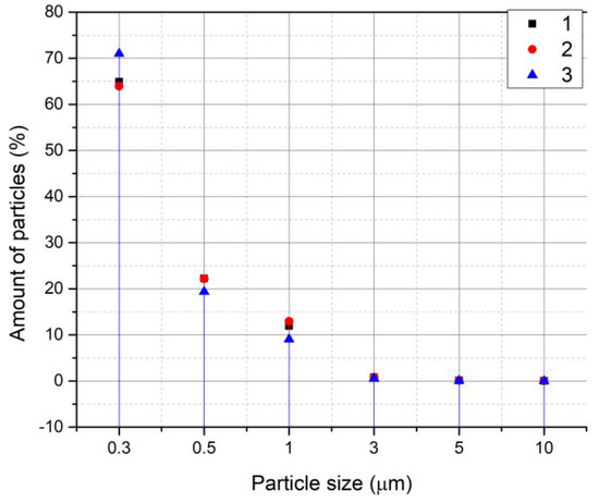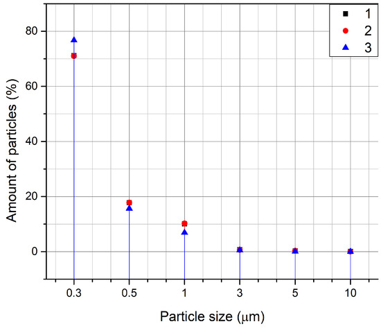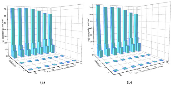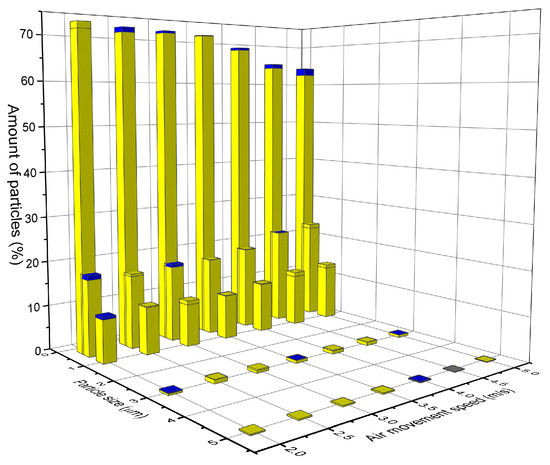 Particles larger than 10 μm in the air stream were separated in the cyclone and deposited in it. Experimental studies were carried out with particles of 0–10 μm size. Very few, up to 0.1%, particles of 10 μm size were recorded in the air stream. This means that the remaining particles (99.9%) were smaller than 10 μm. Most of the particles were 0.3 μm in size, and these particles are the most dangerous for human health. The smaller the particles, the more easily they spread in the environment and the more easily they enter the human body. As a result of the measurements, it was found that particle agglomeration took place in the operating environment of the ion generator as the air flow moved. Depending on the speed of the air flow, the amount of particles up to 0.3 μm in size decreased by 5–6%. This means that these particles agglomerated into particles of 0.4–1 μm in size (Figure 14a,b).