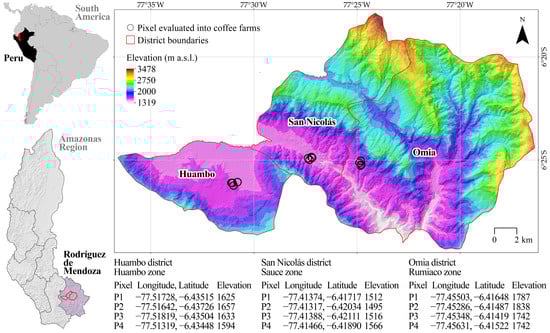 Three coffee growing areas in the province of Rodriguez de Mendoza, located between 1495 and 1838 MASL (Figure 1), were taken as a case example. The working unit was in the areas of Rumiaco (4 pixels), Omia (4 pixels), and Sauce (4 pixels), and the location of 12 pixels of the study area in Rodriguez de Mendoza, Peru is shown in Figure 1. Coffee has been the main product of the economy for more than 20 years.