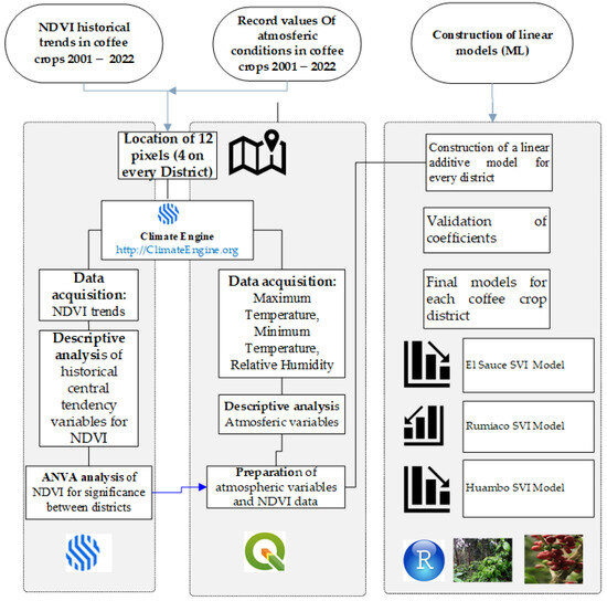 For the statistical methodology, a linear regression model (LRM) of the NDVI in each zone was constructed as a function of climatic variables such as precipitation, maximum and minimum temperatures, relative humidity, and altitude, and was then performed, where NDVI is the NDVI value to be predicted and the climatic variables are the regression coefficients that indicate how each climatic variable influences the NDV. Also, (**) represents the residual error, which is the difference between the observed NDVI value and the value predicted by the model. NDVI is a measure that is used in combination to estimate the health and density of vegetation in specific geographical areas [52]. A linear regression model allows for the investigation of how NDVI is related to other variables and predicts the value of NDVI as a function of these independent variables [53]. The methodological procedure of this research is detailed in Figure 2.