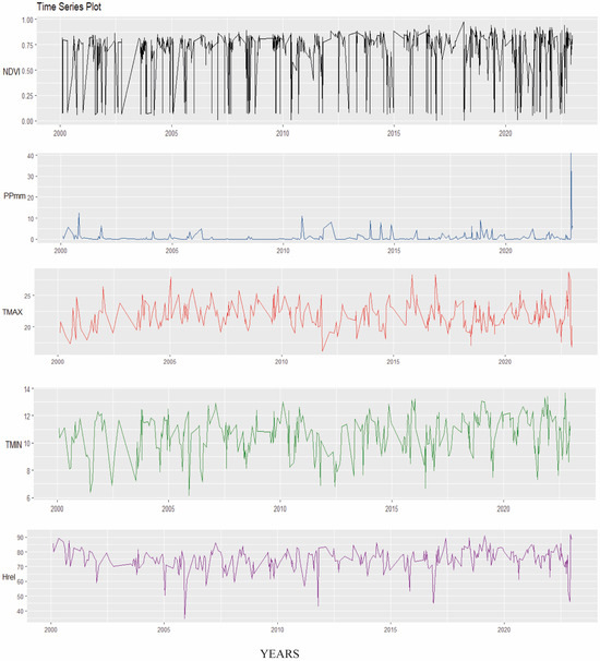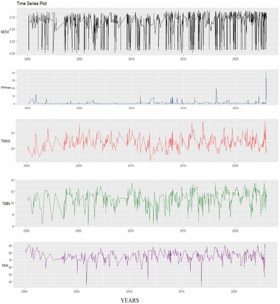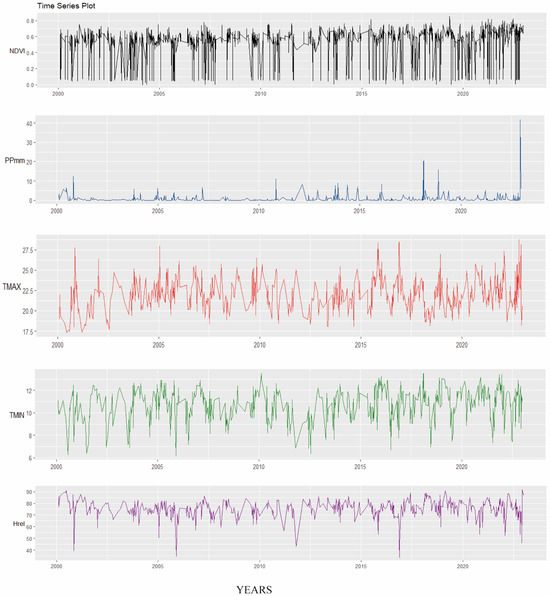 For the historical values of the variables of precipitation (mm), maximum temperatures (°C), minimum temperatures (°C), and relative humidity (%), data download was performed from Climate Engine [49]. Then, using R studio software version 4.2.3, an analysis of historical trends (2020–2022) was made for each zone (after knowing that there are statistical differences of NVI per zone). Table 1 shows a compilation of information on the variables used in this research.