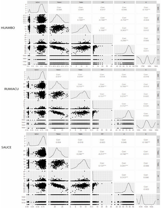 Plot correlation for the climatic variables, elevation, and NDVI according to the study area. * = significance p < 0.05; ** = significance p < 0.01; *** = significance p < 0.001.