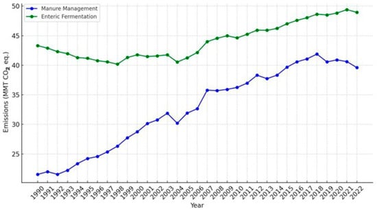 The trends in U.S. dairy emissions from enteric fermentation and manure management between 1990 and 2022. Data source: US EPA https://cfpub.epa.gov/ghgdata/inventoryexplorer (assessed on 10 June 2024).