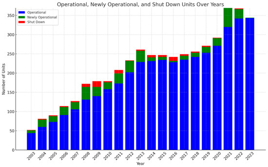 Approximately 26% of all GHG emissions from animal production in the United States are attributed to manure. Of these, 72% are in the form of methane and 28% are nitrous oxide [35]. They generally arise from manure stored under anaerobic conditions. Conceptually, manure management may be improved to reduce GHG emissions through alterations in collection, storage, and utilization. By using manure in biogas systems where the manure-related methane emissions are captured, one can reduce GHG emissions from the storage of manure and in turn generate electricity using the captured methane to replace fossil energy and its emissions. One can also use management to improve the quality of manure when it is utilized as a fertilizer. Most of the storage-related strategies involve treatment in biogas digesters, improving manure storage covering, shortening storage duration, using solid–liquid separation, and changing the animal diet [35]. As of January 2023, the United States has 343 manure-based anaerobic digestion systems that mitigate methane emissions by capturing biogas from the breakdown of animal manure. This includes 290 systems for dairy, 46 for hogs, 8 for poultry, and 9 for beef. A summary of the cumulative number of operating digester systems in the U.S. that process livestock manure is shown in Figure 2.