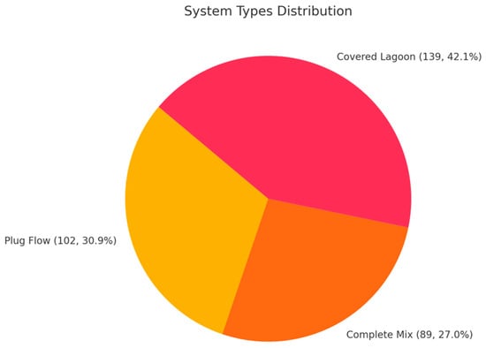 The distribution of the most common types of manure-based anaerobic digesters in the US. Data source: US EPA https://www.epa.gov/agstar (accessed on 11 June 2024).
