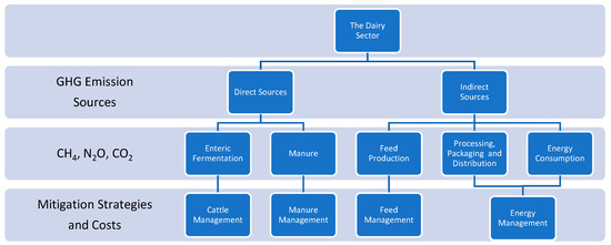 Another significant omission from the reviews is economic concerns involving mitigation costs and effects on dairy product prices, as economics can hinder widespread adoption of emission-reducing mitigation measures [19]. Dairy farmers require information regarding the costs associated with mitigation, as well as opportunities to diversify their income through the production of branded products or participation in carbon offset markets. This study comprehensively reviews the situation covering both direct and indirect sources of dairy GHG emissions, and evidence on mitigation costs and the social cost of GHG emissions. Therefore, the objectives of this review are to assemble evidence on direct and indirect emission sources from the dairy sector across the total supply chain starting from feed production through until milk processing; summarize relevant mitigation strategies; review estimates of mitigation costs and their components; and identify research gaps, particularly regarding economics and incentive policy design.