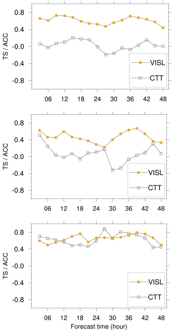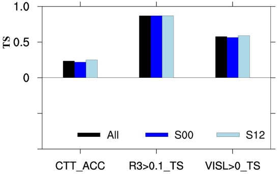 Figure 1 presents the average forecast performance of CTT, R3 > 0.1, and VISL > 0 over 48 h for the weather modification model of the CPEFS. According to the black bars (All), on average, across all 16 cases, the spatial ACC between the model-forecasted CTT and observed results was 0.23, the TS for R3 > 0.1 was 0.87, and the TS for VISL > 0 (the frequency of occurrence was 79.3% within the observed cloud region) was 0.58. Comparing the dark (S00) and light blue bars (S12), it was observed that the forecasting performances of R3 > 0.1 between the 00 and 12 UTC model initialization were similar. The spatial ACC of cloud top temperature and TS for supercooled clouds initialized at 12 UTC were slightly higher at 0.25 and 0.59, respectively, compared to the scores of 0.22 and 0.56 for the 00 UTC initialization.