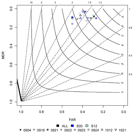 Performance diagram summarizing the average Threat Score (TS, labeled solid contours), False Alarm Rate (FAR, X-axis), and Missed Detection Rate (MDR, Y-axis) of supercooled clouds (VISL > 0) in 48 h forecasts for different cases (different shapes, first two digits represent the month and last two digits represent the date of the cases) initialized at 00 (S00, dark blue) and 12 UTC (S12, light blue) over 8 days in the model (ALL is the average of S00 and S12, black).