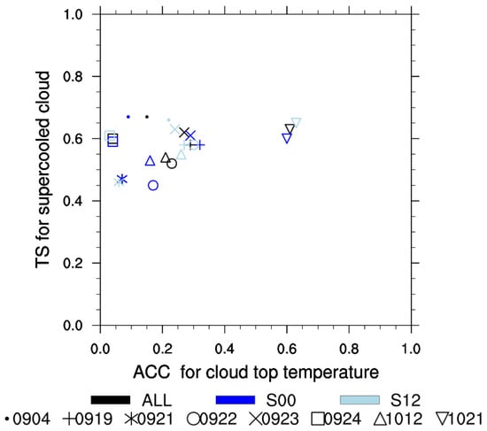 The scatter plot between the TS of supercooled clouds and spatial Anomaly Correlation Coefficient (ACC) of cloud top temperature (CTT) for 8 cases (0904, 0919, 0921, 0922, 0923, 0934, 1021, and 1021) initialized at 00 and 12 UTC (S00, S12, and All as shown in Figure 2).