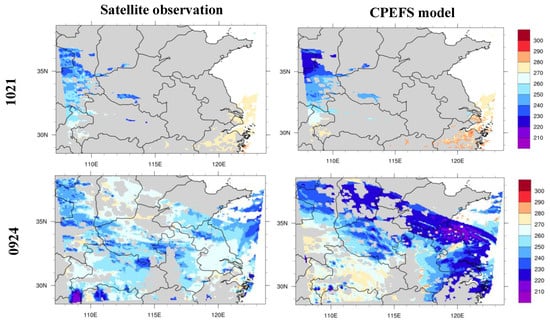 Comparison of the 27th-hour forecasts of CTT (K, right) for cases 1021 (top) and 0924 (bottom) initialized at 12 UTC with observations (left).