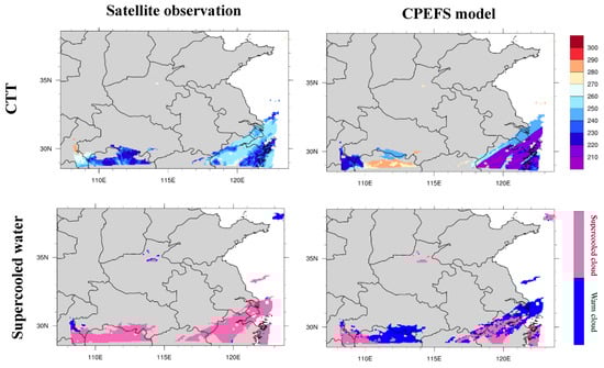 Comparison of the 30th-hour forecasts (right) of CTT (K, top) and supercooled water (pink areas, bottom) for case 0921 initialized at 12 UTC with observations (left).