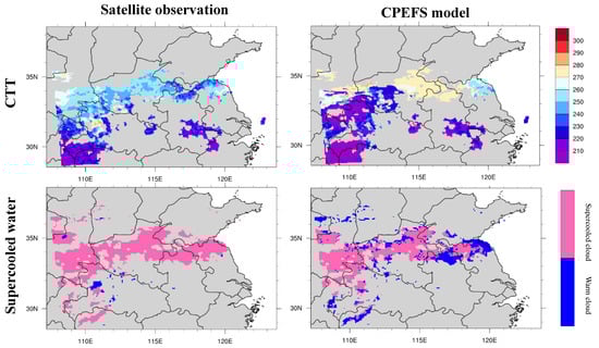 We utilized and extracted the high-spatial–temporal-resolution cloud products from the Himawari-8 geostationary satellite with a wide coverage and high-quality precipitation observation data from the integrated sources of Chinese automatic stations, satellites, and radars. The forecast and observation results were interpolated onto model grid points at a resolution of 6 km. Quantitative verifications were conducted to assess the forecasting ability of the weather modification model of the CPEFS in the central region of China (29~39° N, 107~124° E), focusing especially on supercooled cloud systems of the artificial precipitation stimulation target regarding its macroscopic characteristics and surface precipitation.