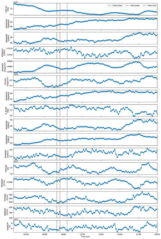 The temporal evolution of the SHARP parameters is explored for all events in our list, Table 1, with an example shown in Figure 1 for the event on 1 August 2010. Daily overviews are generated for all events. The flare timings are over-plotted with different colors, for the start (green), peak (red) and end (blue) times, respectively. Some of the parameters have redundant trends, though we decided to keep all 16 SHARP parameters while performing the correlation analysis.