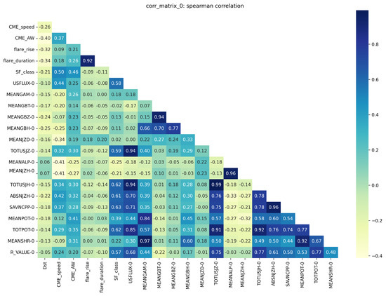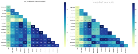 In addition, we present the correlation matrices for two sub-sets, namely, for the strong (with Dst index ≤ −100 nT) and weak GSs (with Dst index from ≤−50 to −100 nT). The results are shown in Figure 3 for the Spearman correlations and in Figure A2 for the Pearson correlations. The correlation matrices are optimized for the sub-set of parameters with moderate-to-strong correlations. The strong GSs are associated with halo CMEs only; thus, the AW parameter will be dropped. Apart from the flare rise and duration, we drop also MEANGBT, MEANGBZ, MEANJZD, MEANALP, MEANJZH. The matrices with the complete set of parameters are available online, https://astro.bas.bg/project-sun/ (accessed on 31 July 2024). After comparing the results in Figure 3, as expected, we obtain stronger correlations for nearly all pairs for the case of stronger GSs. Moreover, for the majority of the correlations between the SHARP parameters, the differences between the strong and weak GS samples are statistically significant.