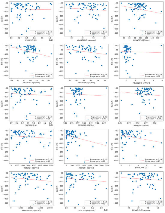 The distribution (linear scatter plots) of the SHARP parameters vs. the Dst index are explicitly shown in Figure 4, except for the R-value due to a lack of correlation in that case (close to 0). Overall, the points tend to cluster at lower values of the Dst (i.e., upper part of the scatter plots).