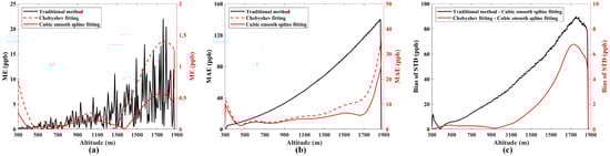 Figure 3b shows the MAE of the CH4 concentration profile calculated using different methods. It can be seen that, except for below 400 m, the MAE of the cubic smoothing spline fitting results is smaller than that of the other two methods in each layer. Specifically, within the initial range of 300 m–420 m, the ME and MAE of the CH4 concentration profile calculated using Chebyshev fitting and cubic smoothing spline fitting are both slightly greater than those calculated using the traditional method. This is because Chebyshev fitting and cubic smoothing spline fitting not only focus on accuracy at a certain height of the profile, but also ensure that the overall fitting error of the profile is minimized. Therefore, noise at high altitudes may have an impact on signals with high SNR at low altitudes, resulting in slight errors. Nevertheless, there is not much difference in accuracy among the three methods at low altitude, while the accuracy of the two fitting methods is much higher than that of the traditional method at high altitudes. Overall, it can still be considered that Chebyshev fitting and cubic smoothing spline fitting perform better than the traditional method. Compared with traditional methods, the maximum reduction in the MAE of the CH4 concentration profile calculated by them was 96.59 ppb and 107.33 ppb, respectively.