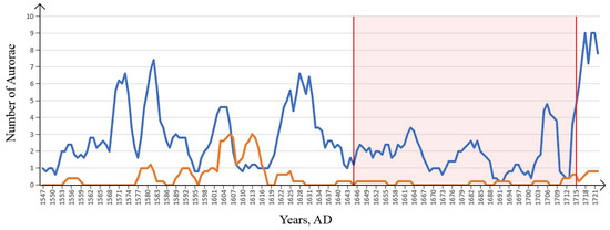 Frequencies of auroral occurrences for the time span 1547–1721 AD, according to Rethly and Berkes (1963)—orange, and Schröder (1992)—blue, respectively. Number of auroral displays, 5 years moving average. The numbers of Rethly and Berkes represent every entry in their catalog considered by them as genuine aurorae, while for Schröder the lowest values from the published range are given. The Maunder Minimum (MM) is indicated by the shaded area between the two red vertical lines.