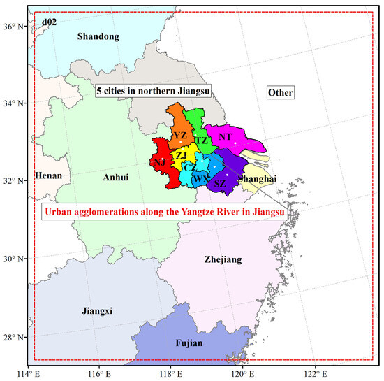 The WRF-CMAQ model was nested in two domains. Domain 01 covered most of the east-central part of China, with a resolution of 27 × 27 km and a grid number of 170 × 130. Domain 02 took UAYRJS as the center, including Jiangsu and its neighboring provinces, such as Shandong, Anhui, Zhejiang, Jiangxi, Fujian and the ocean, with a resolution of 9 × 9 km and a grid number of 112 × 118. In this study, the contributions of the two main ozone precursors, NOx and VOCs, from Nanjing, Zhenjiang, Yangzhou, Suzhou, Wuxi, Changzhou, Taizhou and Nantong, and five cities in northern Jiangsu, Shandong, Anhui, Henan, Zhejiang, Jiangxi, Fujian and others (including D02 other land areas and oceans) were computed using ISAM. The locations of the labeled regions are shown in Figure 1.