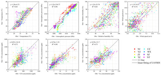 As outlined in Section 2.1, this study utilized hourly data on air temperature, sea level pressure, relative humidity and instantaneous surface wind speed monitored by meteorological stations in the UAYRJS region between 00:00 on 4 September and 23:00 on 8 September 2022. The data were employed to assess the efficacy of the WRF simulation. Additionally, the hourly concentrations of CO, NO2 and O3 were obtained from air pollutant monitoring stations to evaluate the effectiveness of the WRF-CMAQ simulation. Figure 1 illustrates the locations of UAYRJS cities.