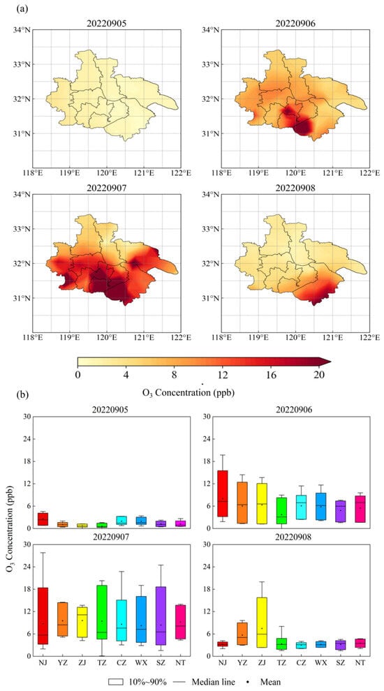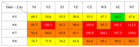 The O3–8 h in UAYRJS from 5 to 8 September 2022 is shown in Figure 3, and ozone pollution was the most serious on 6–7 September, in which CZ, SZ and NT were moderately polluted on two consecutive days, and YZ and WX were moderately polluted on one day. On 8 September, O3–8 h was lower than that of the previous two days, but there were still five cities with light pollution.