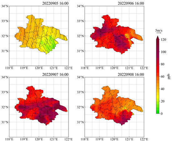 Spatial distribution of ozone concentration changes in UAYRJS from 5 to 8 September 2022. (Note: The shades represent the concentration distribution, and the vector arrows represent the wind direction and speed).