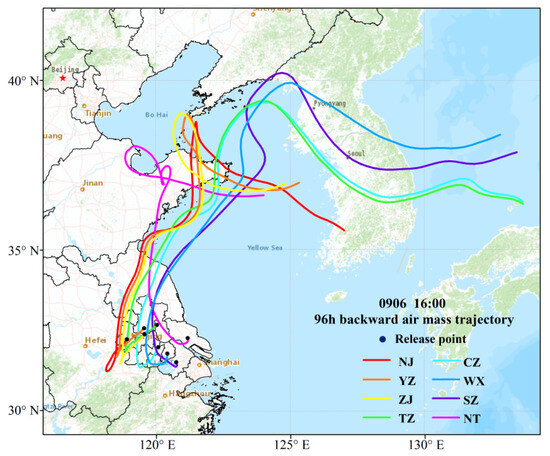 As shown in Section 3.2, it is clear that 6 September was the first polluted day of UAYRJS, and there was an enhanced WPSH process from 5 to 6 September. Furthermore, the main wind direction changed from north on 5 September to south on 6 September. The daily anthropogenic emission sources usually stayed in a steady state, but the weather conditions changed day by day, especially the air mass source. In order to analyze why the pollution event was triggered on 6 September, we used the HYSPLIT model to analyze the air mass transport paths of pollution in the UAYRJS at 16:00 on the day (Figure 6). The air masses arriving at the research area at the time were all from the Yellow Sea and the Bohai Sea first of all; second, they passed through Shandong Province and to the north of Jiangsu Province, and got to UAYRJS; finally, they returned to UAYRJS after passing through Anhui Province in a southerly direction.