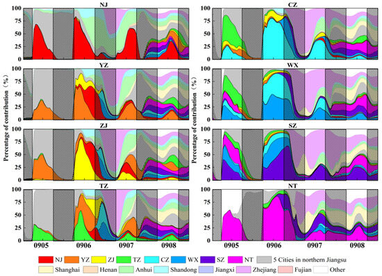 Hourly series of ozone source analysis in UAYRJS from 5 to 8 September 2022. (Note: The superimposed slash mask area represents the nighttime, with no mask for daytime. The coloring map depicts the relative contribution from different regions represented by different colors to the hourly concentration in a given city; they add up to a total of 100%. The highly saturated colors represent the UAYRJS, and relatively low saturation represents other areas).
